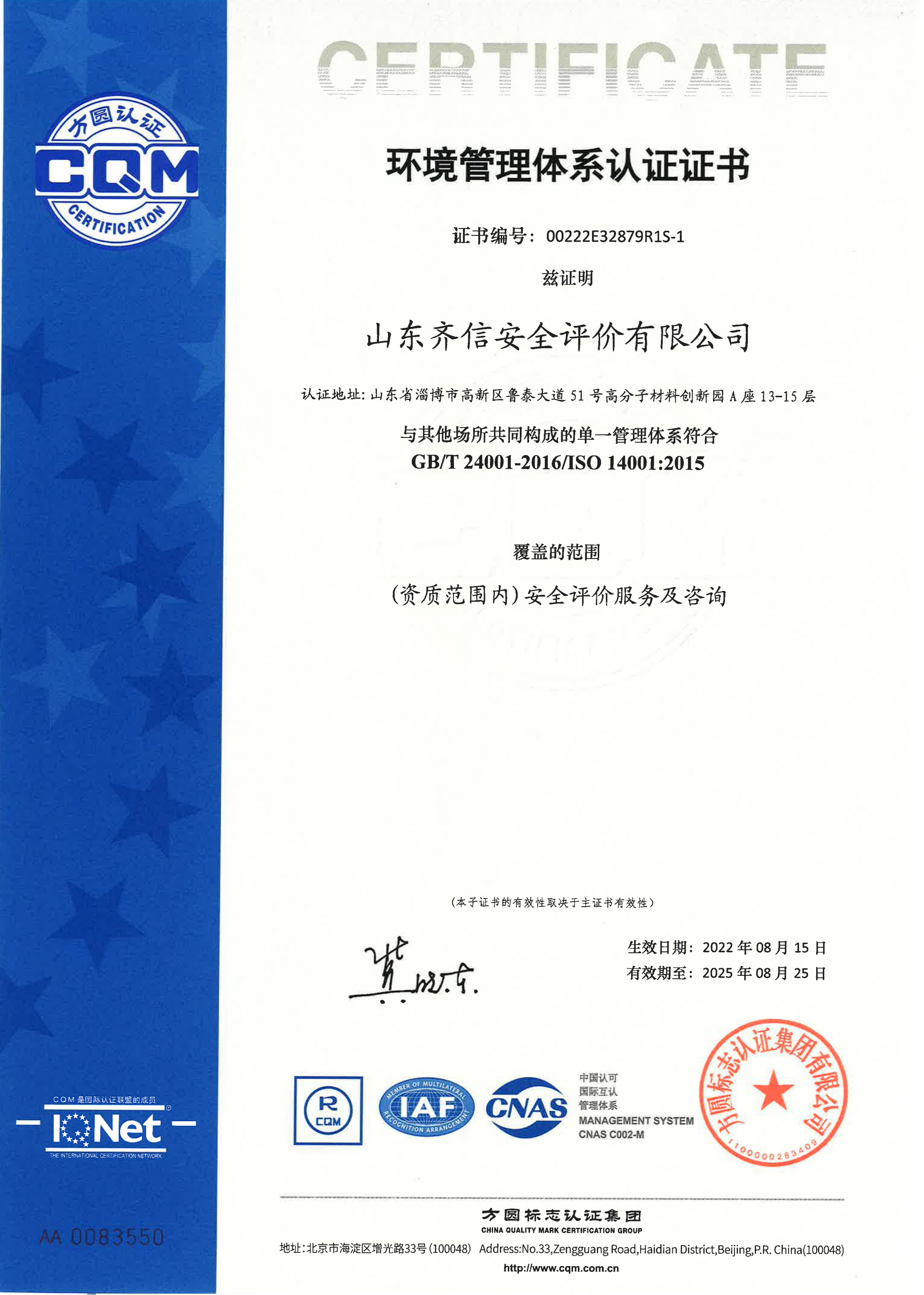 環境管理體系認證證書